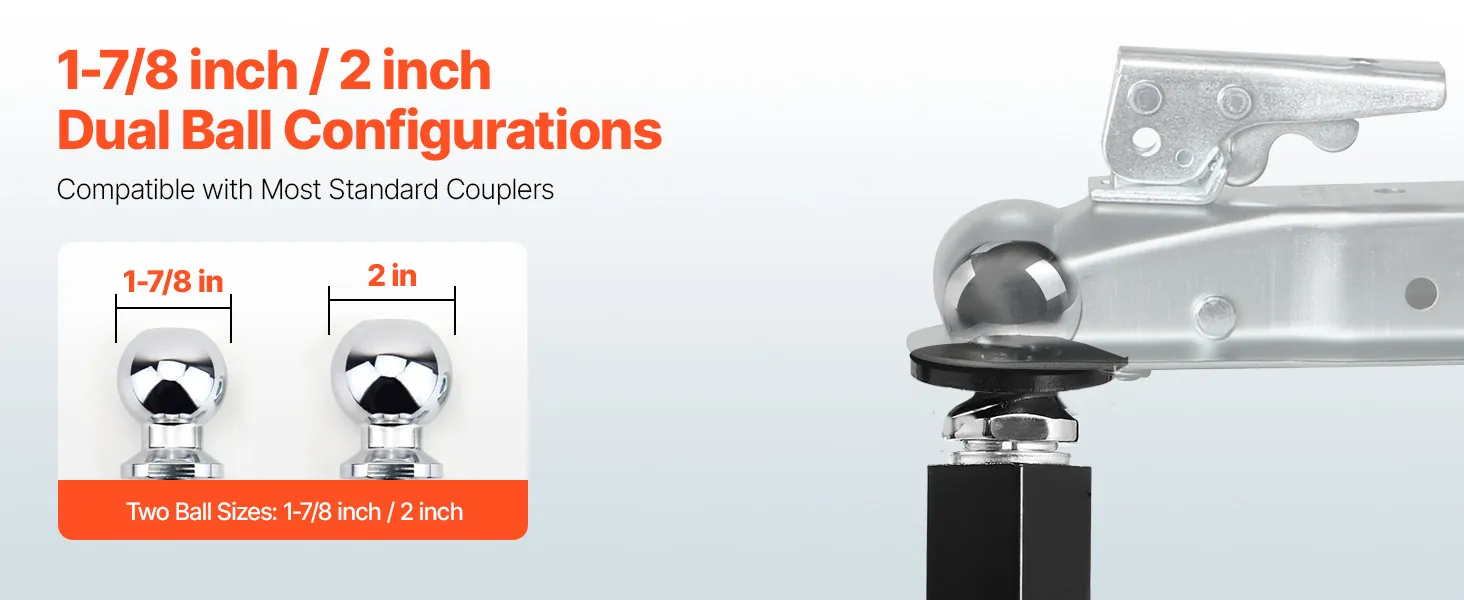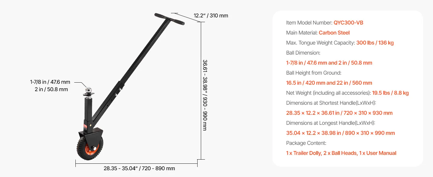 Vyberte si medzi veľkosťou gule 1-7/8 palca alebo 2 palce a vyberte si z možností nastavenia výšky 16,5 palca alebo 22 palcov. Tento vozík na sťahovanie prívesov je kompatibilný s väčšinou spojovacích zariadení a rôznymi veľkosťami prívesov, čím poskytuje bezproblémovú prispôsobiteľnosť pre váš príves alebo loď.