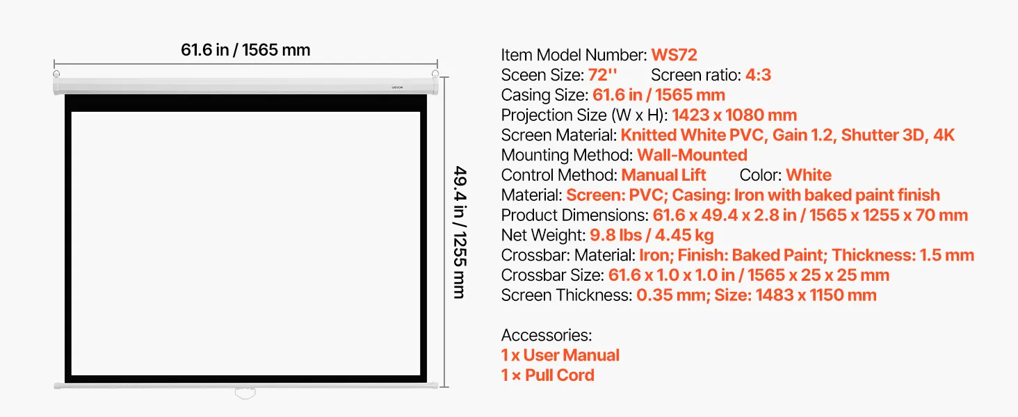 Sťahovacie projekčné plátno 1829 mm 4:3 4k/1080 hd na stenu s lanom