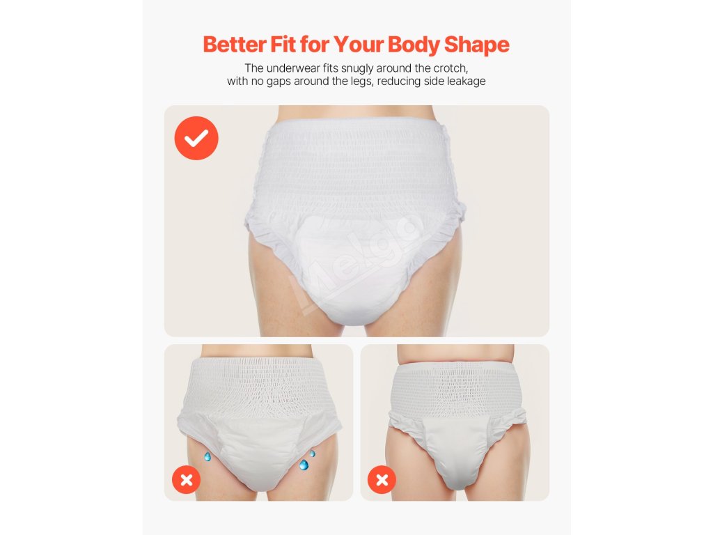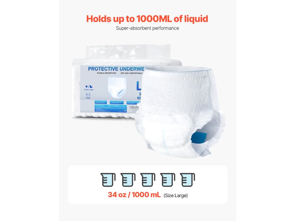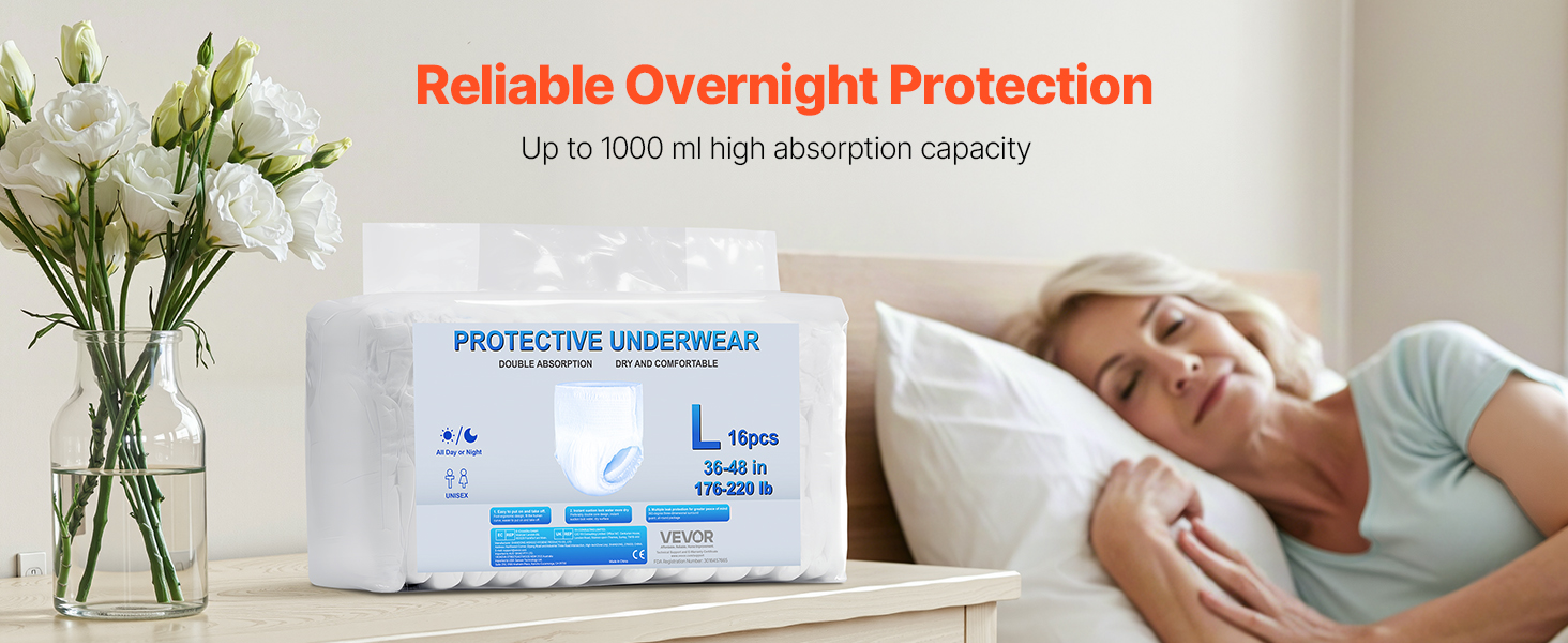 Táto ochranná bielizeň poskytuje vysokoabsorpčnú ochranu, ktorá dokáže zadržať až 34 uncí (1000 ml) tekutiny. Vyznačuje sa viacnásobnou ochranou proti úniku s priliehavým elastickým pásom, trojrozmernou ochranou okolia a modrou akvizičnou vrstvou pre spoľahlivú ochranu počas dňa aj noci.