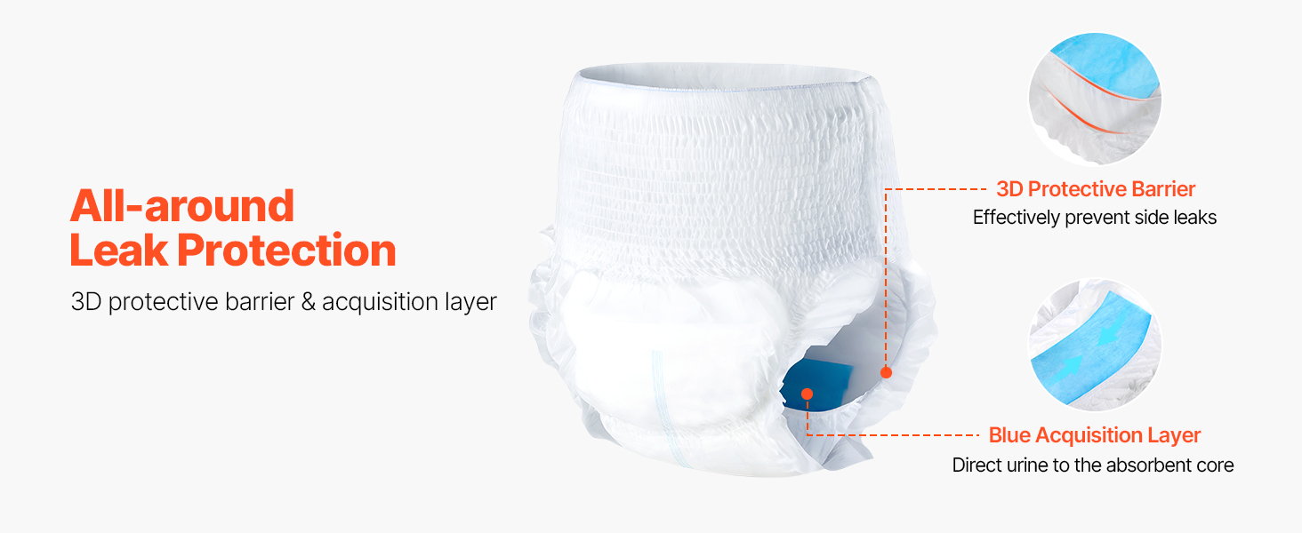 Naša sťahovacia vložka pre dospelých je navrhnutá s 360-stupňovou trojrozmernou ochranou okolia, ktorá účinne zabraňuje bočným únikom. A modrá akvizičná vrstva smeruje moč do absorpčného jadra, čím zabezpečuje maximálnu savosť a trvalú suchosť pre úplnú ochranu a pohodlie.