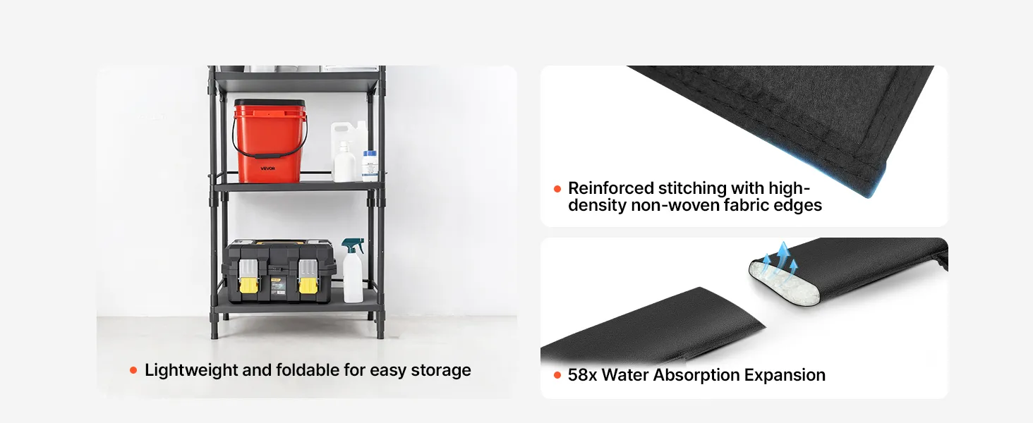 Odpoveď: 1. Nie je vhodná na rýchlo tečúcu vodu alebo dlhodobú pevnú ochranu. 2. Funguje na rovných povrchoch (betón/dlažba/asfalt); vyhýbajte sa ostrým predmetom. 3. Pred uskladnením musí byť dôkladne vysušený - čas schnutia sa líši podľa podnebia.