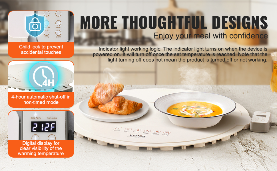 Celý povrch elektrického ohrievacieho podnosu sa rovnomerne ohrieva, čím zabezpečuje dlhotrvajúce teplo pre vaše jedlo, takže si môžete kedykoľvek vychutnať teplé jedlá.