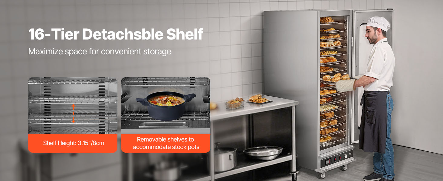 Ohrievač potravín Hot Box je vybavený 16 odnímateľnými policami, ktoré sú stabilnejšie ako štandardné sieťové regály. Nastaviteľná výška a odnímateľné police uľahčujú umiestnenie vyšších položiek.