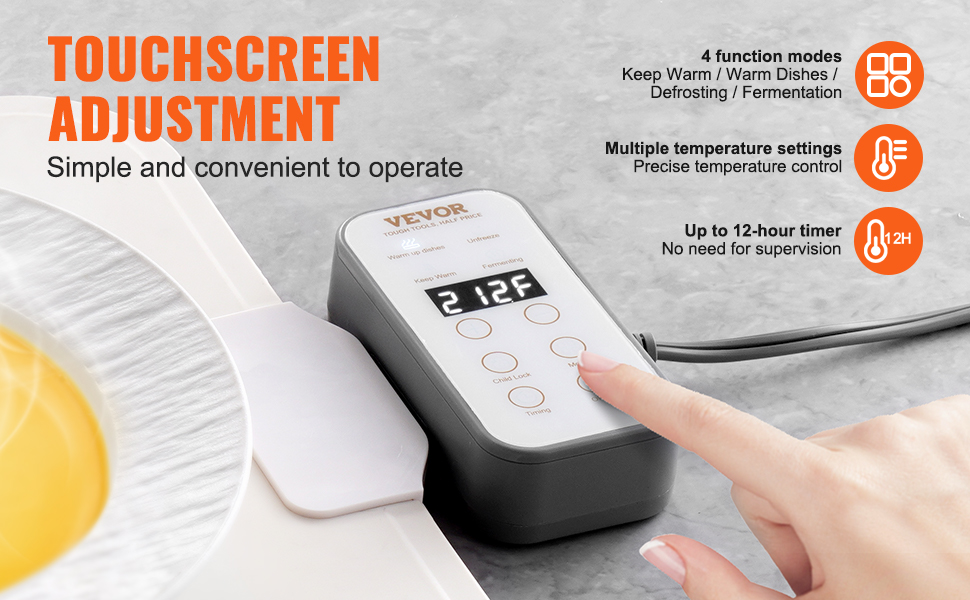 Naša elektrická ohrievacia tácka má 4 funkčné režimy a viacero nastaviteľných teplotných nastavení, dotykový displej umožňuje jednoduché a pohodlné ovládanie.