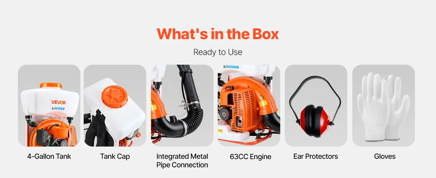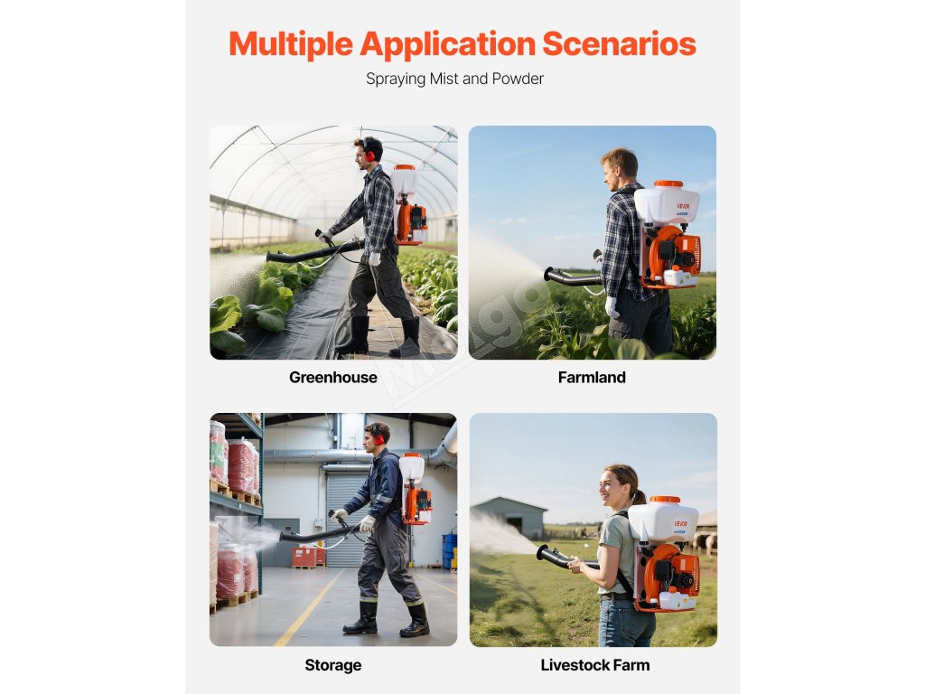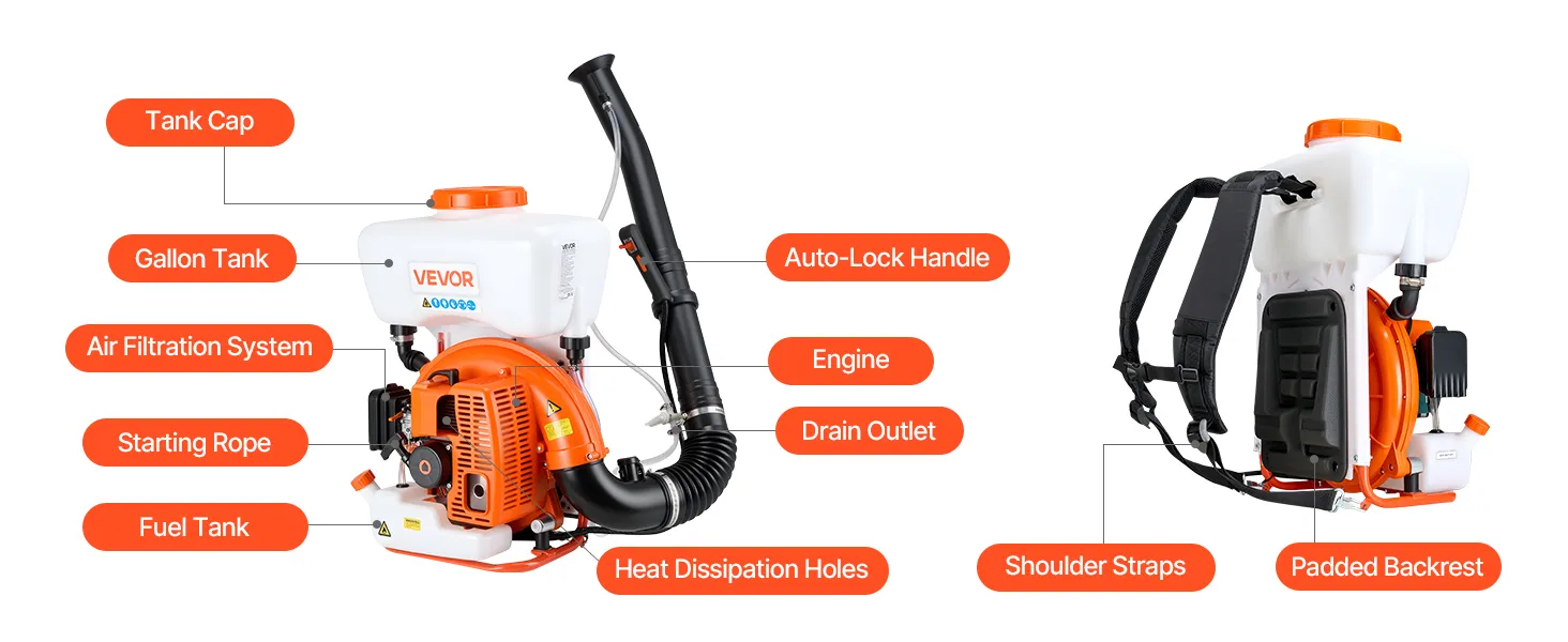 Batohový benzínový hmlovač 63cc 3hp 16l nádrž na kvapaliny a prášok