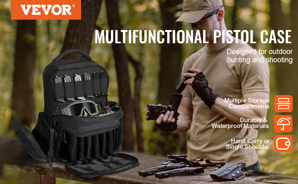 Táto strelecká taška na ručné zbrane je vyrobená z polyesteru 600D s vysokou hustotou, vďaka čomu je nepremokavá a odolná. Je vybavená nastaviteľnými polstrovanými ramennými popruhmi a elastickou, priedušnou chrbtovou vložkou na pohodlné nosenie. Uzamykateľné zipsy zabezpečujú bezpečnú prepravu strelných zbraní a streliva.