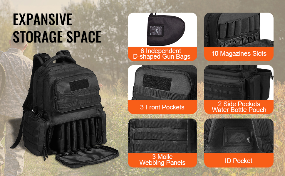 Strelecká taška obsahuje 6 samostatných vreciek na zbrane v tvare D na bezpečné uloženie 6 ručných zbraní. Má tiež 10 samostatných priehradiek na zásobníky spolu s 3 prednými priehradkami, 2 bočnými vreckami a držiakom na fľašu s vodou na predmety, ako sú ochrana sluchu, ochranné okuliare, baterka, rukavice a ďalšie.