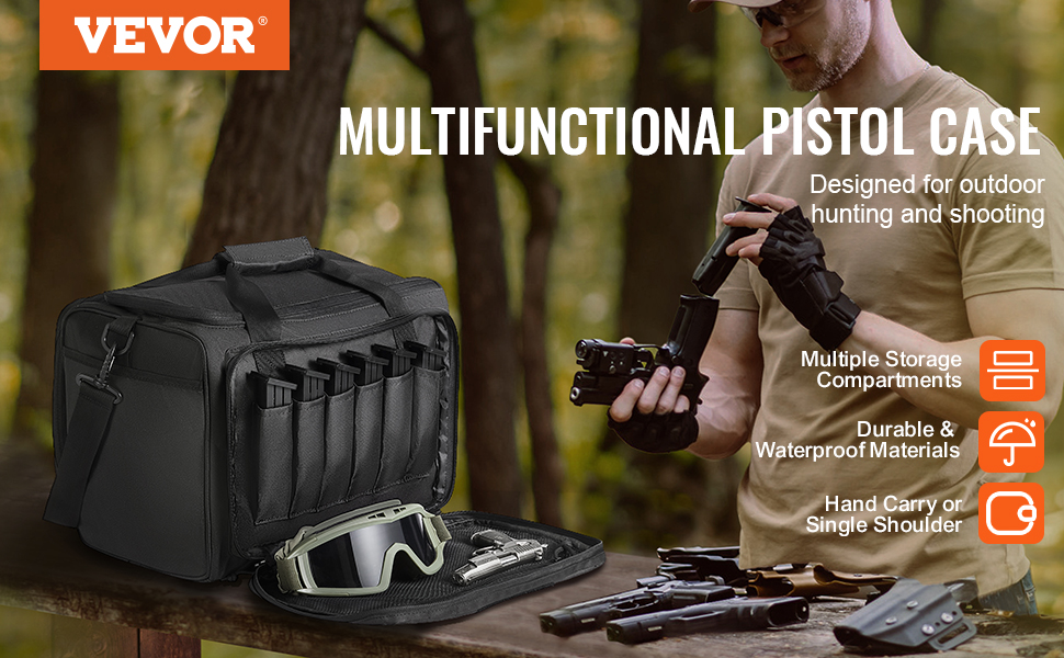 Taška na ručné zbrane je vyrobená z odolného polyesteru 600D, je nepremokavá a dobre polstrovaná na ochranu pred nárazmi. Je vybavená pevnou rukoväťou, nastaviteľným polstrovaným ramenným popruhom a uzamykateľnými zipsami na bezpečnú prepravu.