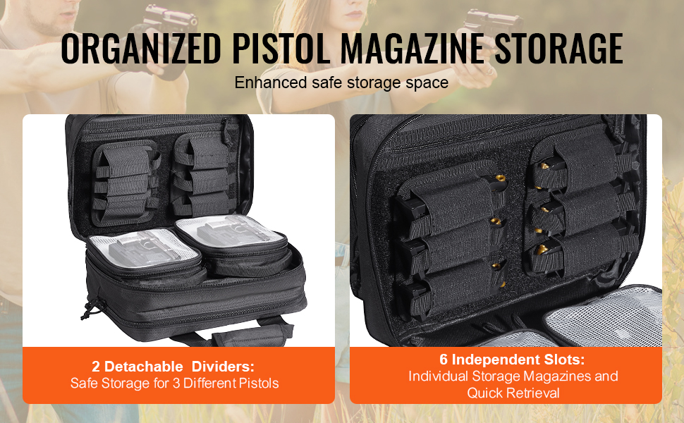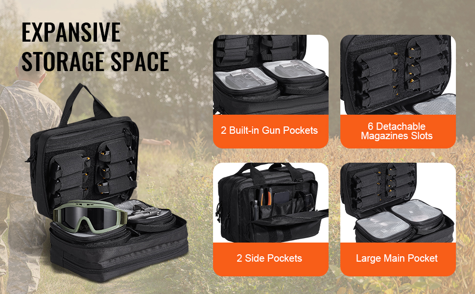 Taška na pištoľ má 2 zabudované vrecká na pištoľ a 6 odnímateľných priehradiek na zásobníky. Do hlavného oddelenia a 2 dodatočných priehradiek možno uložiť predmety, ako sú ochrana sluchu, ochranné okuliare, baterka, rukavice a ďalšie.