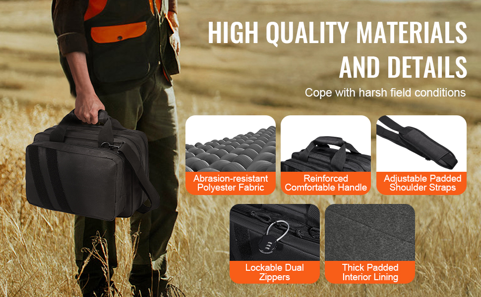 Táto taška na strelnicu je vyrobená z nepremokavého a odolného polyesteru 600D. Je vybavená hrubým vnútorným polstrovaním, ktoré chráni strelné zbrane pred nárazmi a opotrebovaním. Obsahuje robustnú rukoväť, nastaviteľný polstrovaný ramenný popruh na pohodlné nosenie a uzamykateľné zipsy na bezpečnú prepravu.