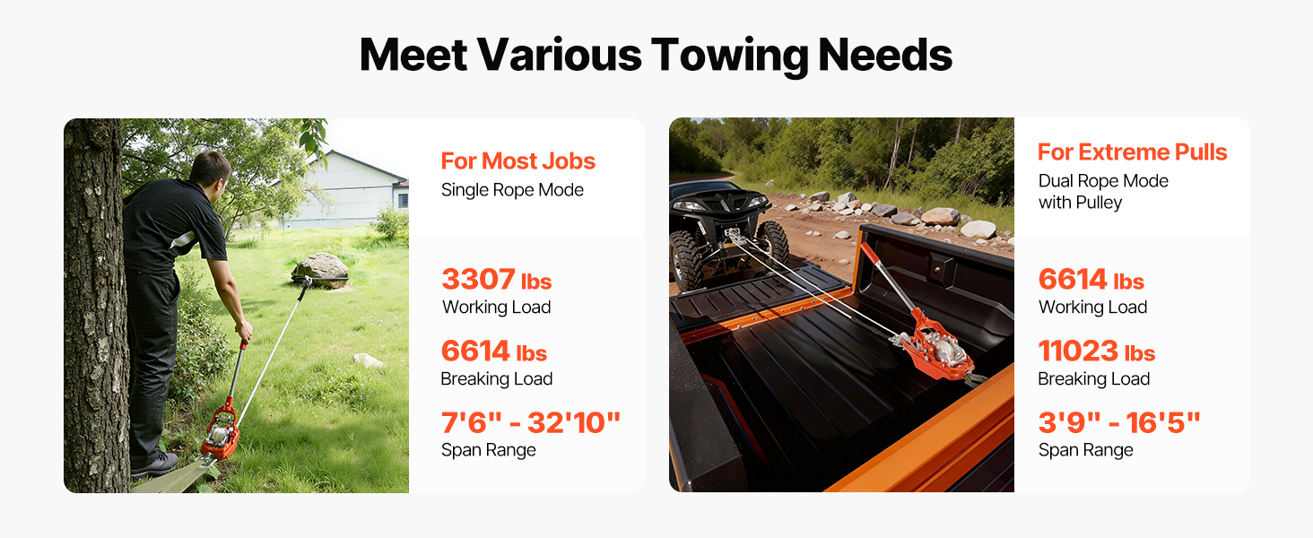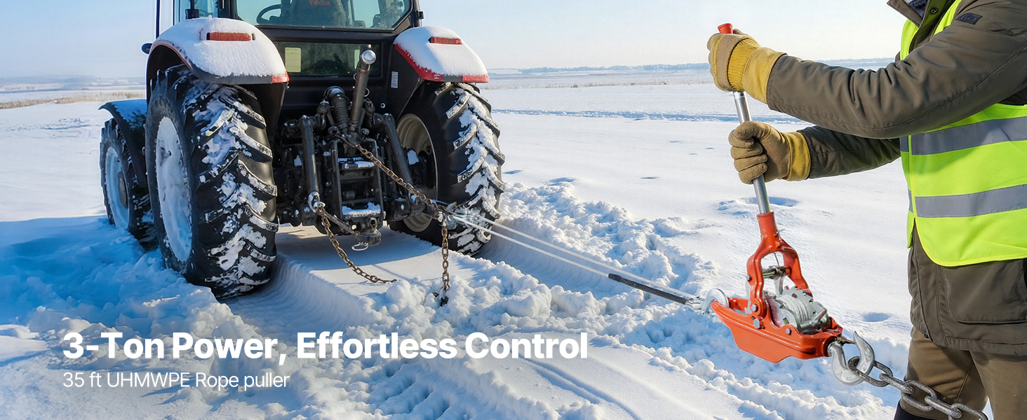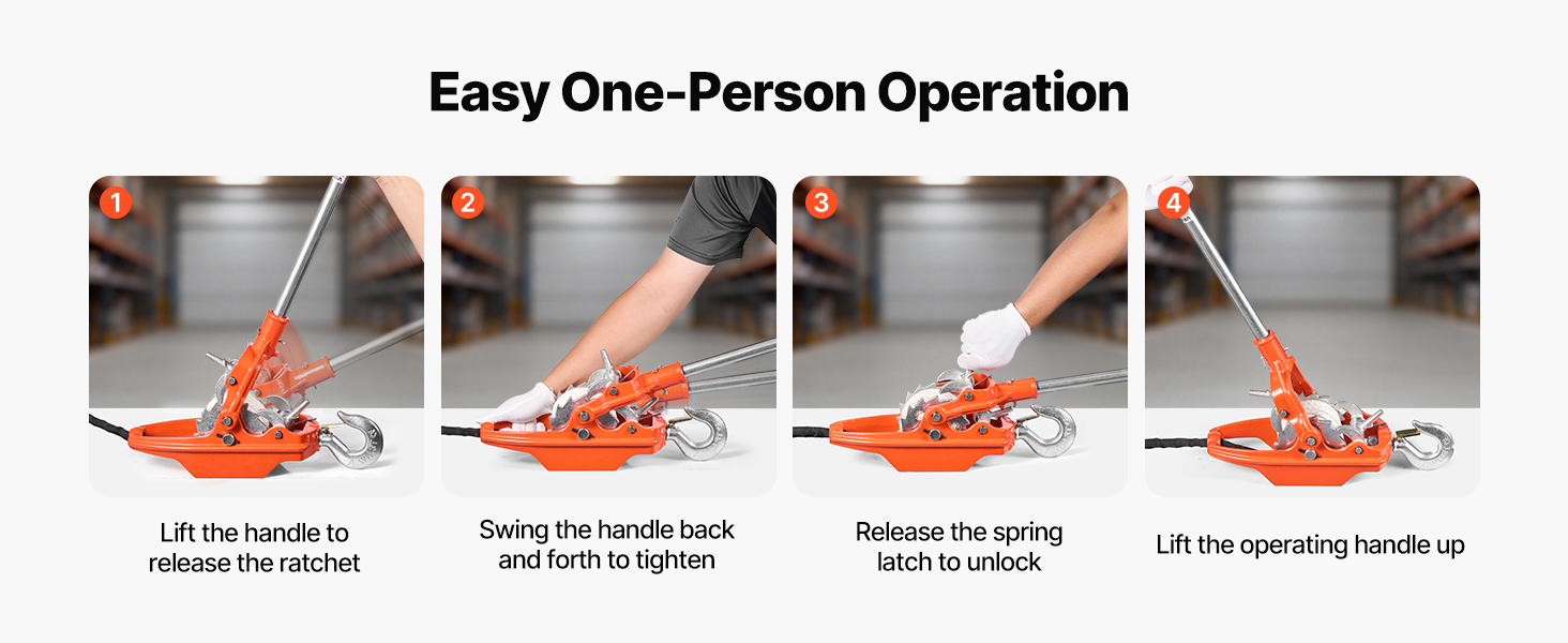 Tento výkonný ťahák využíva bezpečný ráčnový systém, ktorý udržuje lano pevne na mieste. Stabilný úchop pomáha zabrániť náhlemu uvoľneniu a zabezpečuje bezpečnejšie a kontrolovanejšie ťahanie a prepravu.