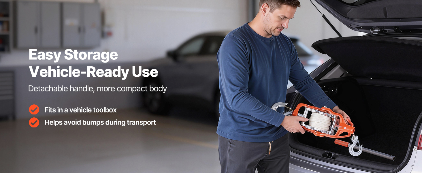 Tento lanový navijak funguje bez elektrickej energie, takže je vždy pripravený na použitie. Prenosná konštrukcia sa perfektne hodí do nákladných vozidiel, prívesov, dielní alebo garáží, kde je k dispozícii na rýchle použitie.