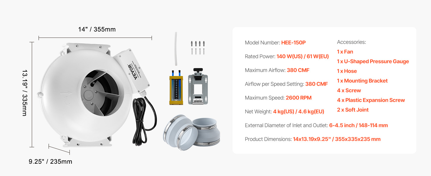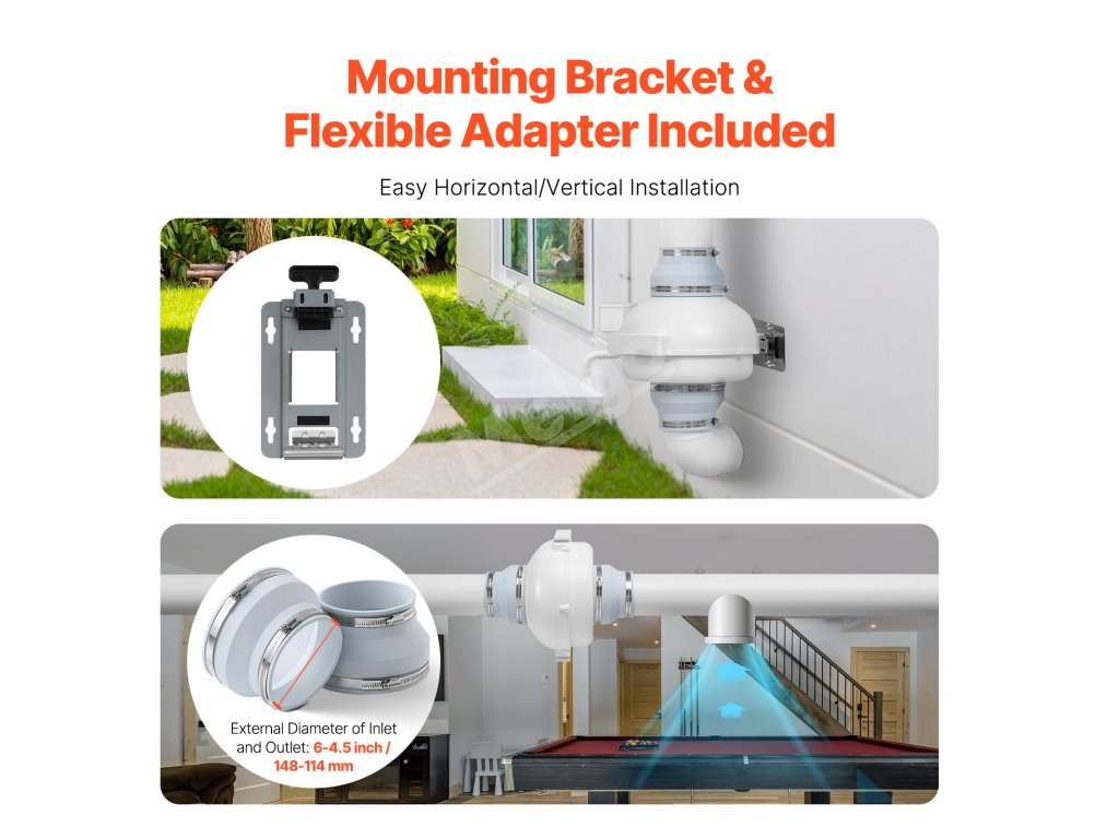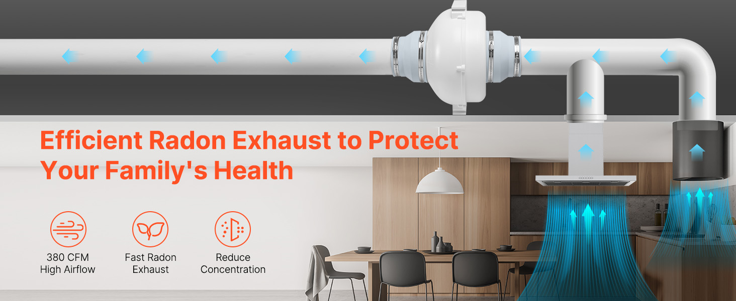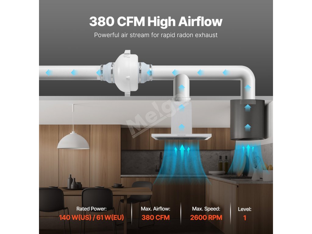 S prietokom vzduchu 380 CFM tento radónový ventilátor rýchlo znižuje úroveň plynu radónu v interiéri, čím zabezpečuje zdravé prostredie na dýchanie pre vašu rodinu.
