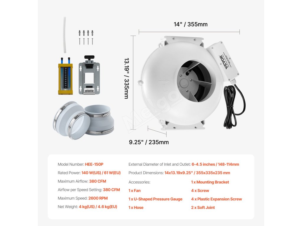 Sada na inštaláciu radónového ventilátora 6–4.5 inch, 380cfm, 2 spojky