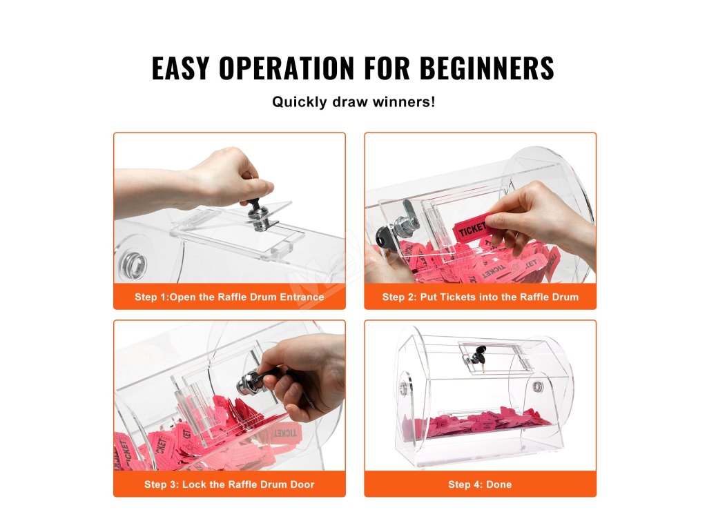 Bubon na lístky je vybavený uzatvárateľným otvorom na lístky a dvierkami, ktoré možno uzamknúť kľúčom, čím sa eliminujú obavy z náhodného vypadnutia alebo rozsypania lístkov počas žrebovania. Jeho používanie je jednoduché - stačí otvoriť dvierka, vložiť lístky, zamknúť dvierka kľúčom a spustiť tombolu.
