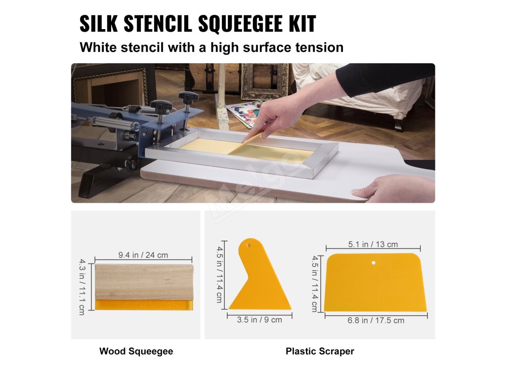Súprava VEVOR obsahuje vysokokvalitné sieťotlačové stierky. Tieto stierky sa ľahko používajú a poskytujú hladké nanášanie farby na váš projekt. Ich konštrukcia zaručuje trvanlivosť a odolnosť voči opotrebovaniu. Stierky sa dodávajú v rôznych veľkostiach, vďaka čomu sú univerzálne. Dajú sa použiť na rôzne veľkosti a vzory tlače. Takisto sa ľahko čistia, čo zaručuje ich dlhodobé používanie.