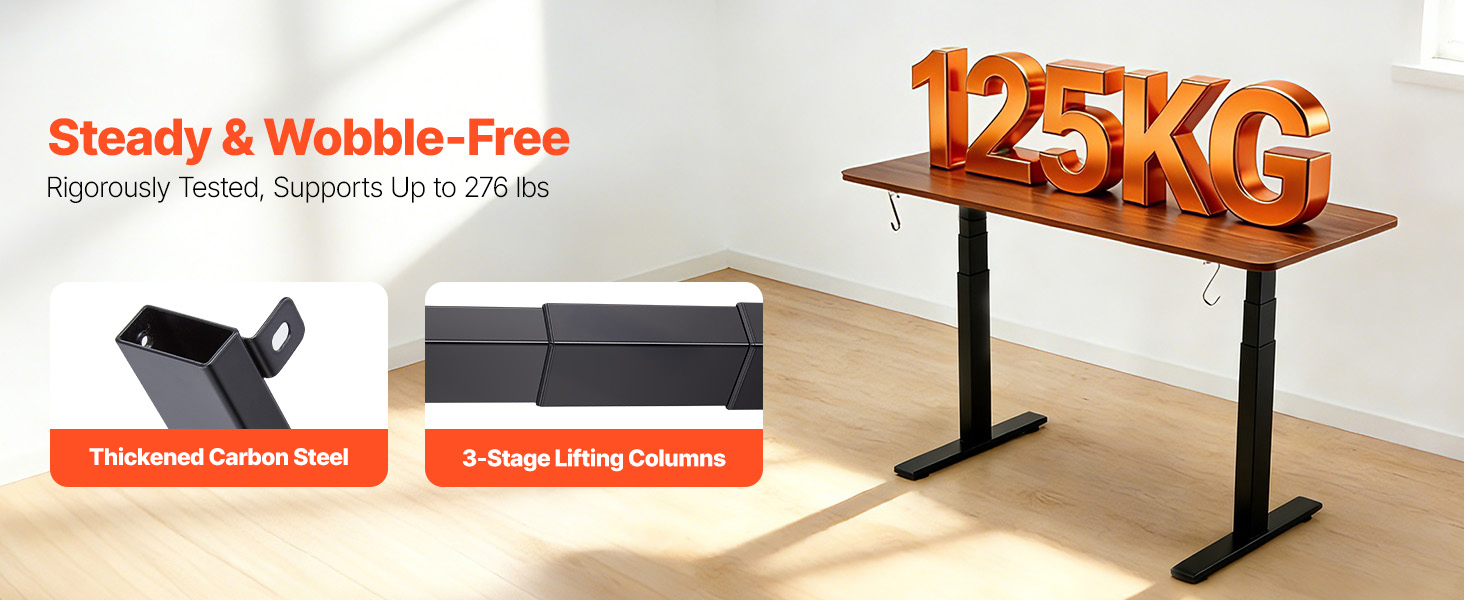 Tento rám stola je vhodný pre každú polohu, je vybavený tichým systémom s dvoma motormi a unesie až 125 kg, čo z neho robí spoľahlivý doplnok vášho pracovného priestoru.