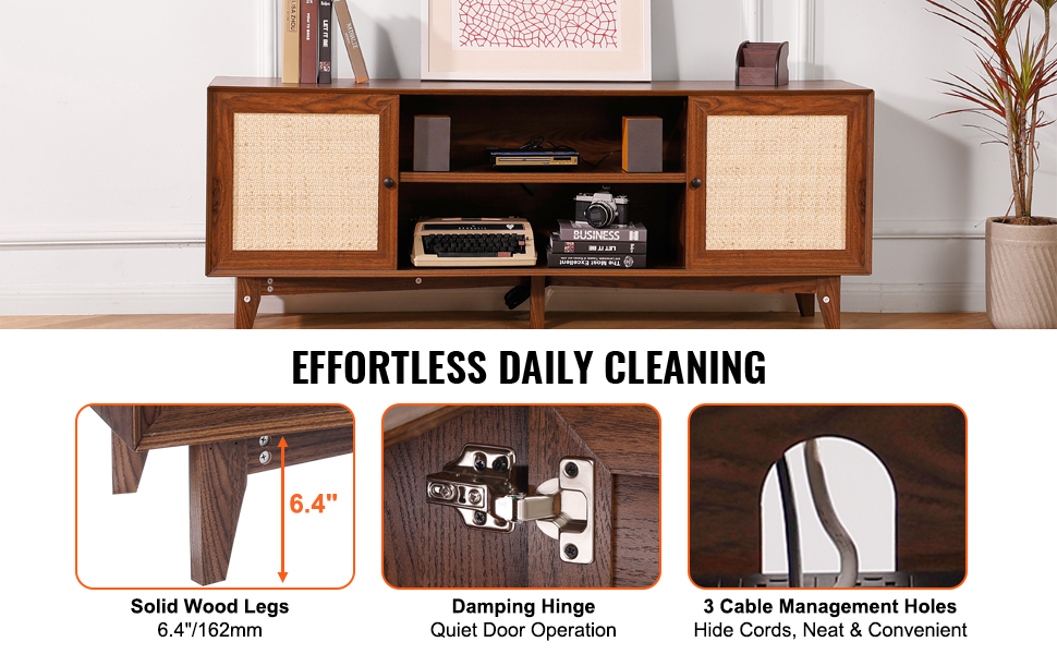 Vďaka veľkým ratanovým skrinkám na oboch stranách poskytuje súkromie a organizáciu. Stredná otvorená polica je výškovo nastaviteľná od 0 mm do 64 mm a ponúka dostatok úložného priestoru na DVD, audio zariadenia, CD a knihy.
