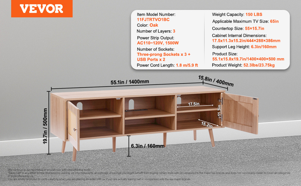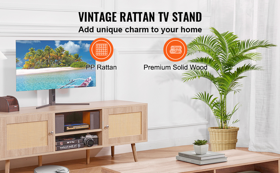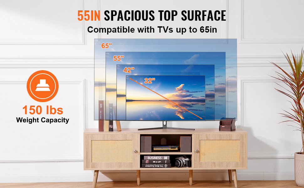Stolík s rozmermi 55 × 15,7 palca pojme 65-palcový televízor a unesie až 150 kg. Ak ho nepoužívate na televízor, ratanové zábavné centrum je ideálne aj na vystavenie dekoratívnych predmetov.