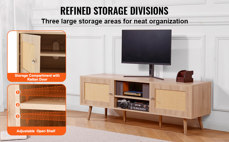 Obsahuje veľké ratanové úložné skrinky na oboch stranách pre súkromie a organizáciu. Stredná otvorená polica má nastaviteľnú výšku od 0 do 64 mm a poskytuje vhodný úložný priestor na DVD, audio zariadenia, CD a knihy.