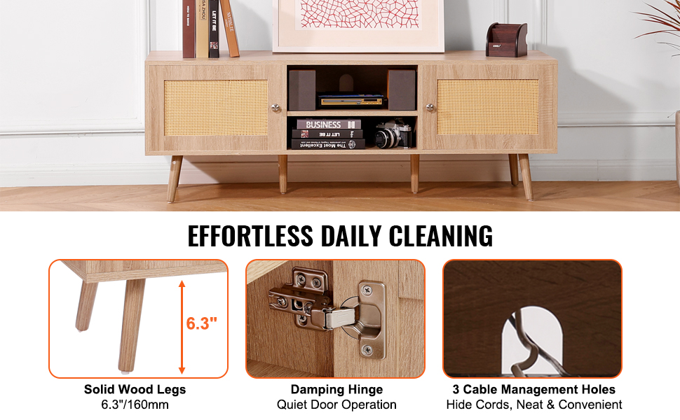 Nohy z masívneho dreva s výškou 6,3" zabezpečujú dostatočný priestor medzi boho TV stojanom a podlahou, čo umožňuje prejazd robotického vysávača. Tri otvory na vedenie káblov udržiavajú káble v poriadku a tlmiče na pántoch zabezpečujú tiché zatváranie dvierok.
