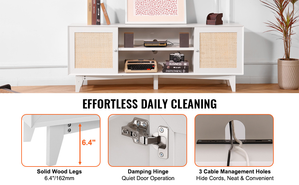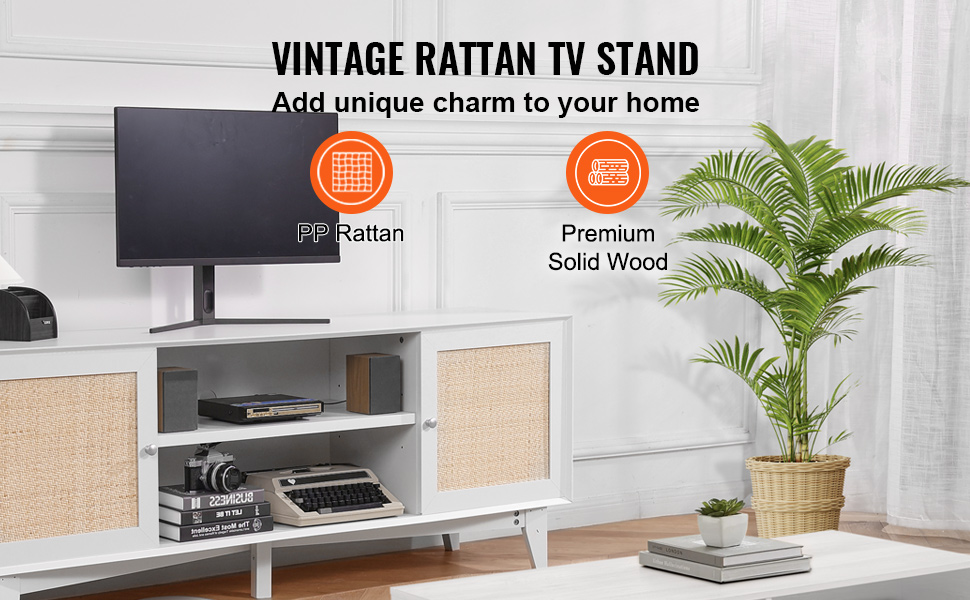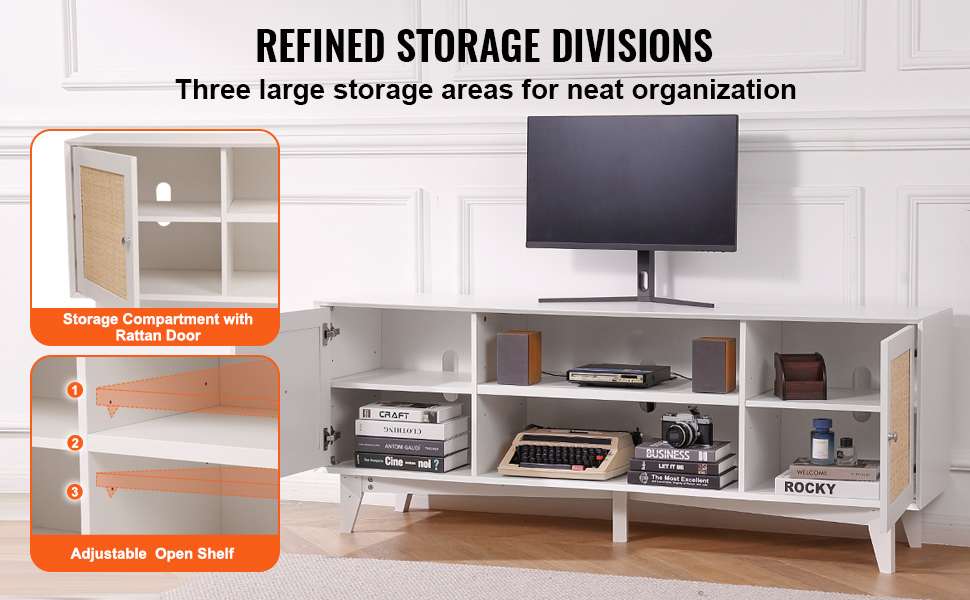 Vďaka veľkým ratanovým skrinkám na oboch stranách poskytuje súkromie a organizáciu. Stredná otvorená polica je výškovo nastaviteľná od 0 mm do 64 mm a ponúka dostatok úložného priestoru na DVD, audio zariadenia, CD a knihy.