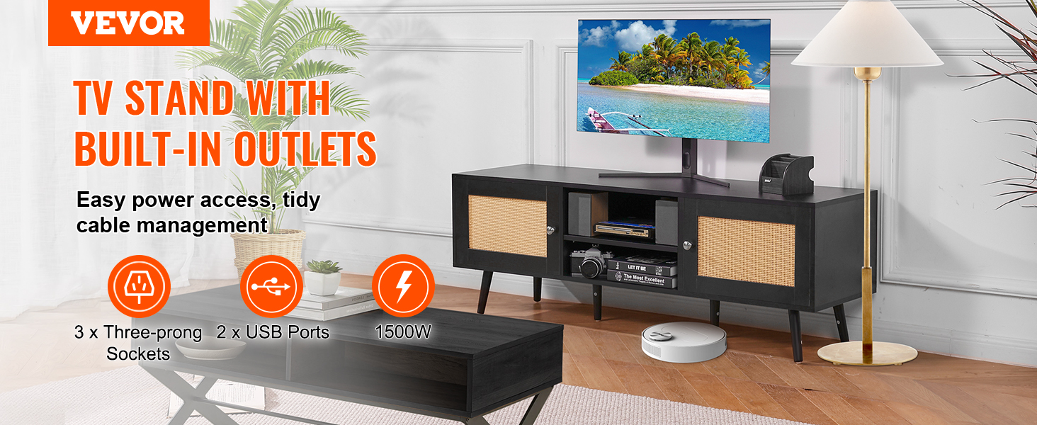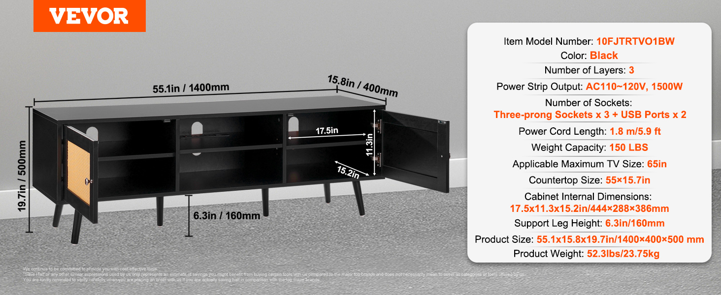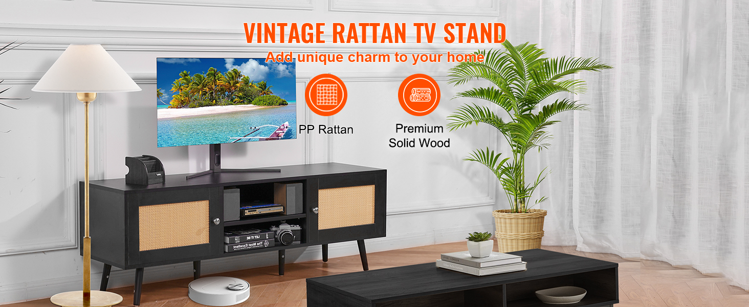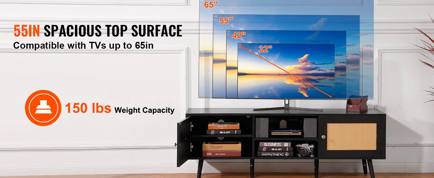 Stolík s rozmermi 55 × 15,7 palca pojme 65-palcový televízor a unesie až 150 kg. Ak ho nepoužívate na televízor, ratanové zábavné centrum je ideálne aj na vystavenie dekoratívnych predmetov.