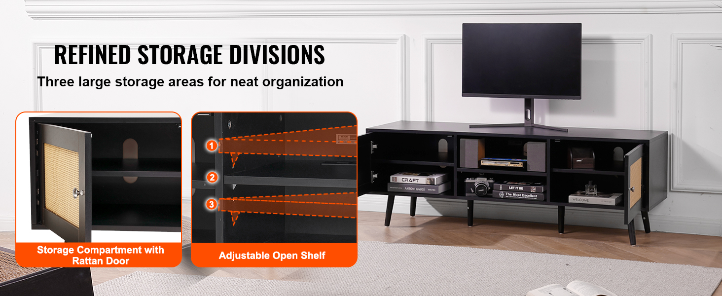 Obsahuje veľké ratanové úložné skrinky na oboch stranách pre súkromie a organizáciu. Stredná otvorená polica má nastaviteľnú výšku od 0 do 64 mm a poskytuje vhodný úložný priestor na DVD, audio zariadenia, CD a knihy.
