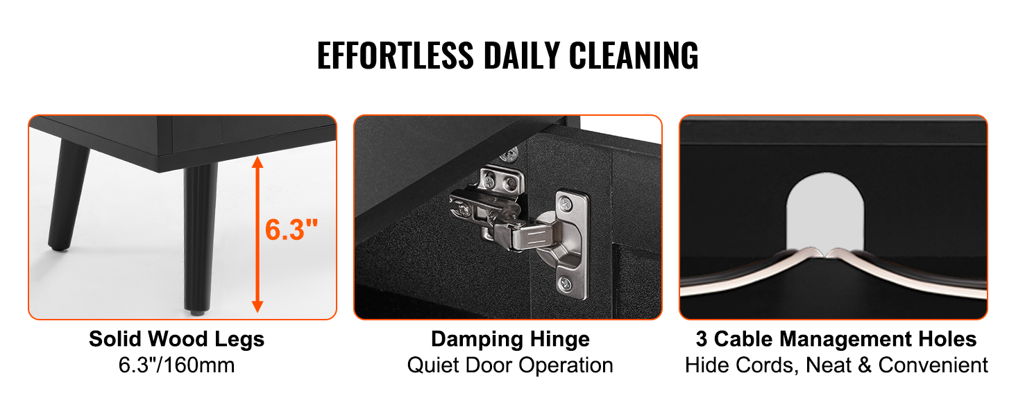 Nohy z masívneho dreva s výškou 6,3" zabezpečujú dostatočný priestor medzi boho TV stojanom a podlahou, čo umožňuje prejazd robotického vysávača. Tri otvory na vedenie káblov udržiavajú káble v poriadku a tlmiče na pántoch zabezpečujú tiché zatváranie dvierok.