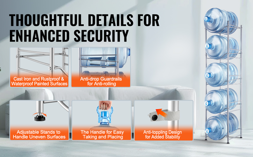 Tento 5-stupňový držiak na džbány na vodu má rozmery 13 x 13 x 53,3 palca, pojme až 5 fliaš a unesie až 209,4 kg. Jeho minimalistický priemyselný dizajn sa hodí do rôznych interiérov, takže je ideálnou voľbou do každého priestoru.