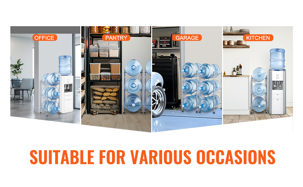 Stojan na džbány na vodu je ideálny do obývacích izieb, skladovacích priestorov, kuchýň, garáží, potravinových špajz, šatníkov, práčovní, telocviční a kancelárií. Poskytuje efektívne riešenie na uskladnenie viacerých fliaš.