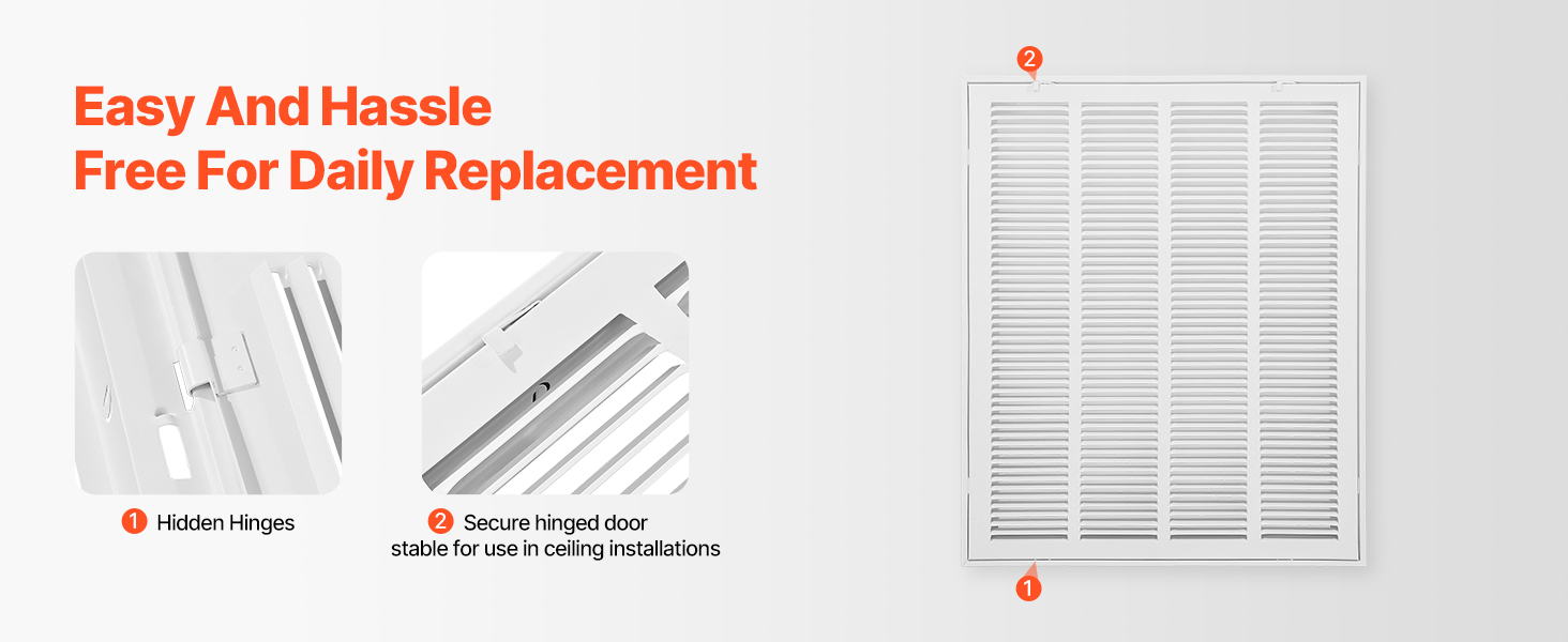 Mriežka spätného vzduchu je vybavená ľahko ovládateľným zámkom na pohodlné otváranie a zatváranie, čo zjednodušuje čistenie a výmenu. Skryté závesy sú vhodné na inštaláciu na strop, čím zabezpečujú vysokú bezpečnosť.