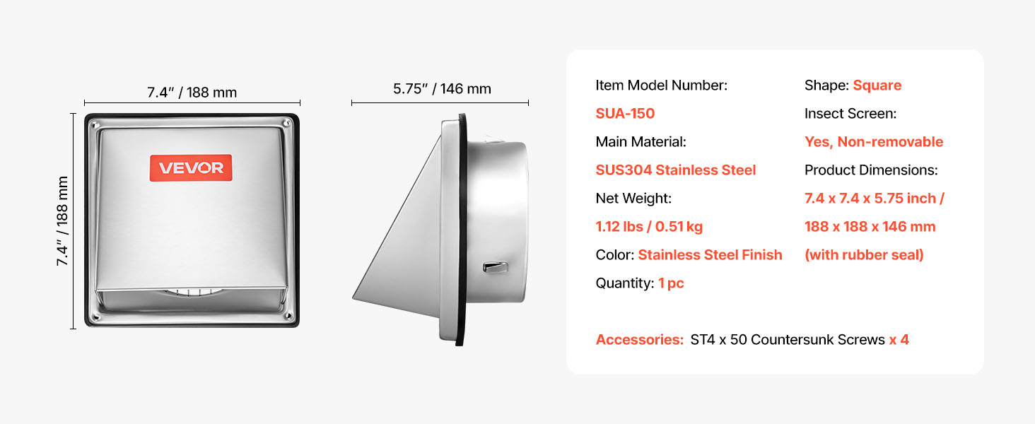 | Rozmery výrobku (s gumovým tesnením) | 7.4 x 7,4 x 5,75 palca / 188 x 188 x 146 mm |