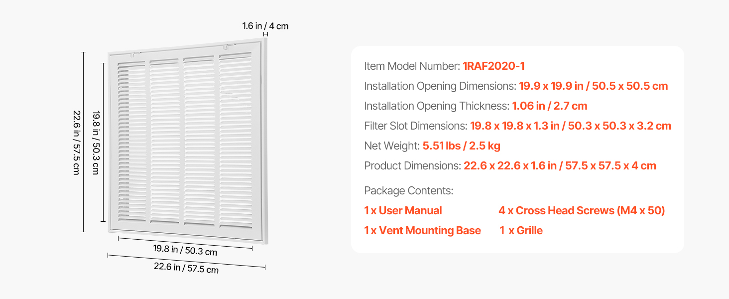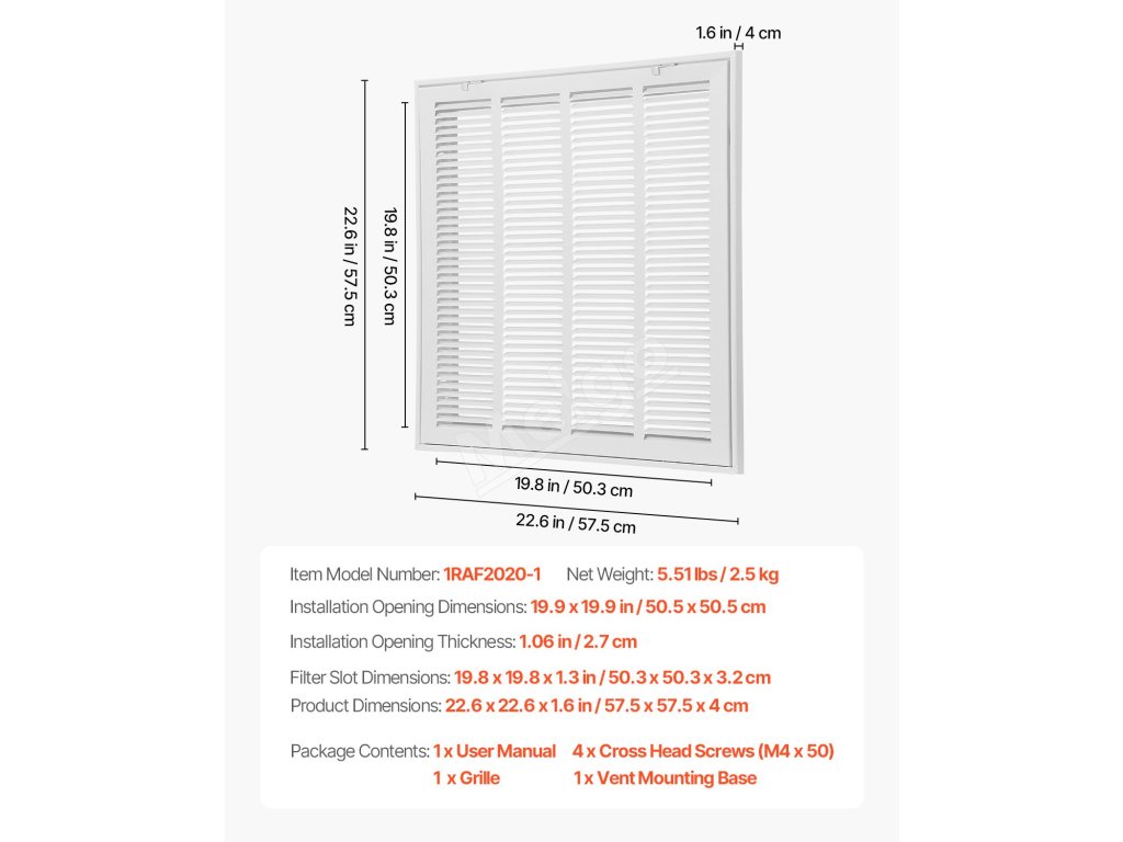 | Rozmery štrbiny filtra | 19.8 x 19,8 x 1,3 palca / 50,3 x 50,3 x 3,2 cm |