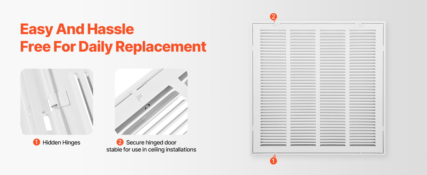 Mriežka spätného vzduchu je vybavená ľahko ovládateľným zámkom na pohodlné otváranie a zatváranie, čo zjednodušuje čistenie a výmenu. Skryté závesy sú vhodné na inštaláciu na strop, čím zabezpečujú vysokú bezpečnosť.