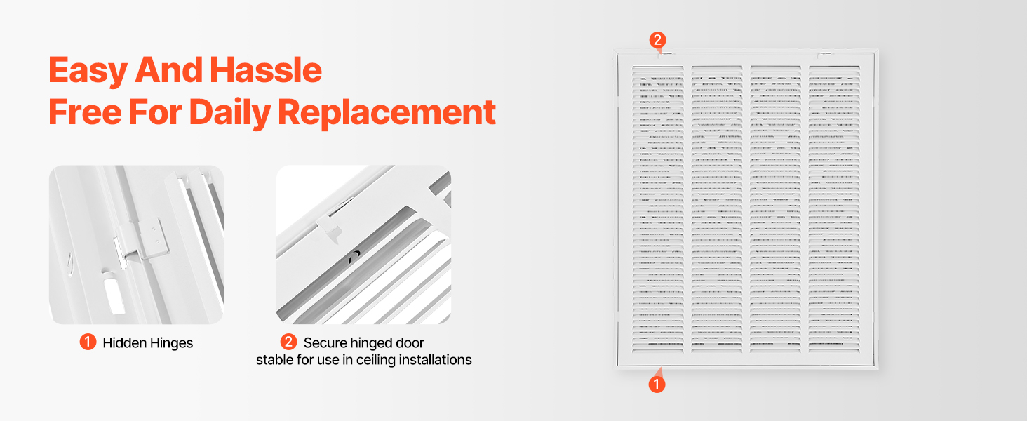 Mriežka spätného vzduchu je vybavená ľahko ovládateľným zámkom na pohodlné otváranie a zatváranie, čo zjednodušuje čistenie a výmenu. Skryté závesy sú vhodné na inštaláciu na strop, čím zabezpečujú vysokú bezpečnosť.