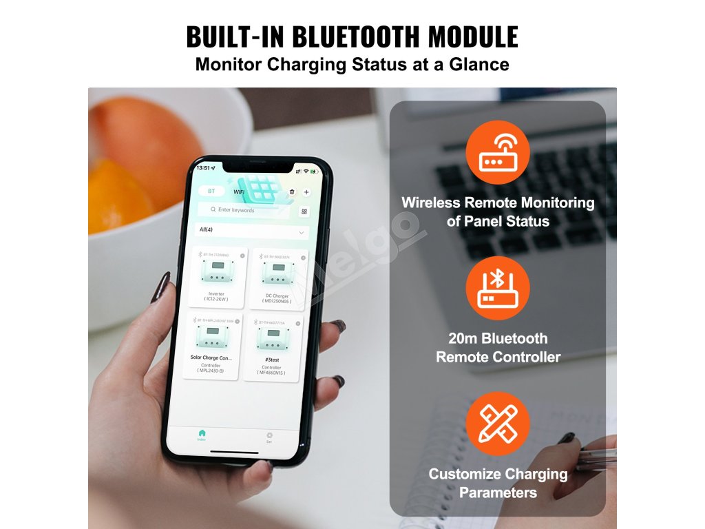 Vybavený zabudovaným modulom Bluetooth, ktorý umožňuje používateľom na diaľku zobraziť základné údaje v dosahu 20 metrov, vďaka čomu je pre používateľov pohodlnejšie monitorovať a upravovať prevádzkový stav zariadenia mppt solar controller.