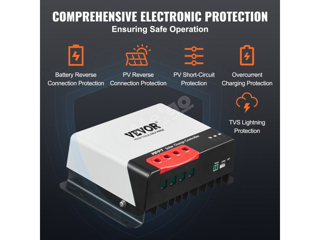 Tento regulátor nabíjania 12V/24V je vybavený komplexnými ochrannými funkciami, medzi ktoré patrí okrem iného ochrana proti spätnému pripojeniu batérie, ochrana proti spätnému pripojeniu FV, ochrana proti skratu FV, ochrana proti nadprúdu počas nabíjania a ochrana proti blesku TVS.