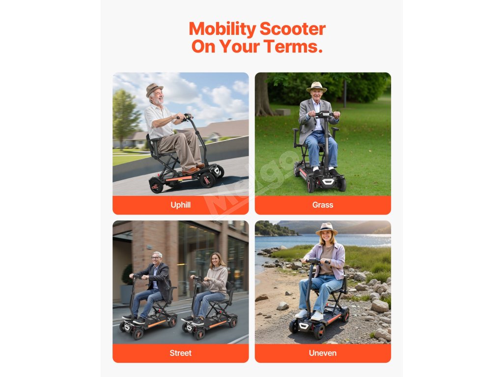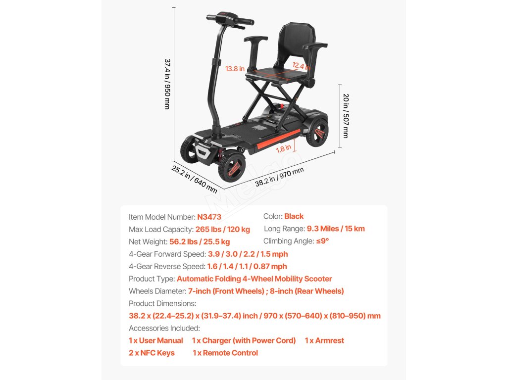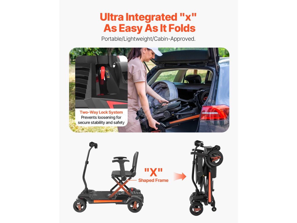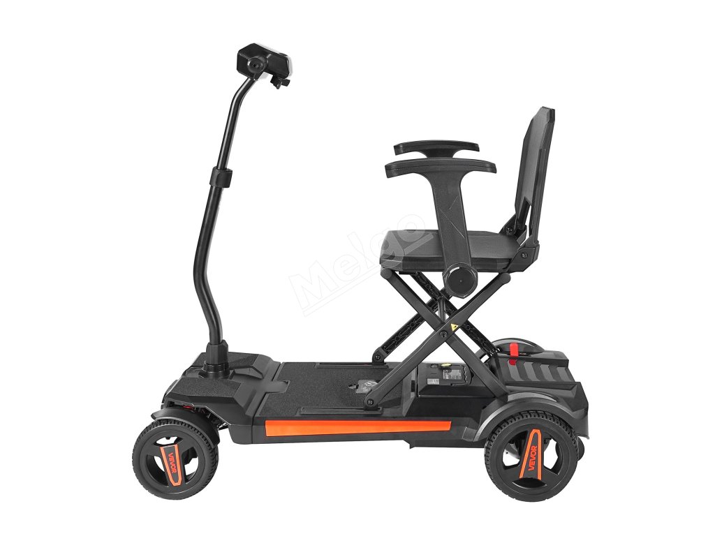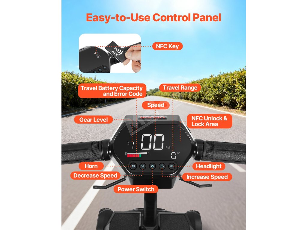 Štvorkolesový integrovaný automatický skladací skúter VEVOR unesie až 120 kg a poskytuje lepšiu mobilitu seniorom, dospelým a osobám so zdravotným postihnutím. Je vybavený inteligentným diaľkovým ovládaním na jednoduché ovládanie a dodáva sa s 2 kľúčmi NFC na rýchle a bezpečné odomykanie.