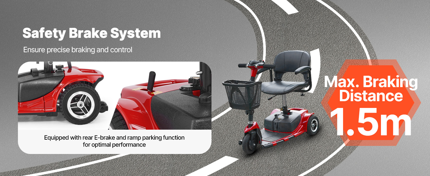 Tento skladací mobilný vozík, vybavený citlivým dvojitým brzdovým systémom (zadná E-brake a funkcia parkovacej rampy), zaručuje rýchle zastavenie a presné ovládanie. Max. Brzdná dráha: 1,5 m.