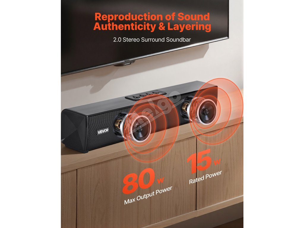 80W soundbar 2.0 pre TV má ľavý a pravý kanál v dizajne, ktorý poskytuje silné basy a vysokú hlasitosť výstupu. Od šokujúcich filmových efektov až po hlboké basy hudobných efektov dokáže bez problémov poskytnúť a zároveň zabezpečiť jasnú a vysokú hlasitosť pre skvelý zážitok z počúvania.