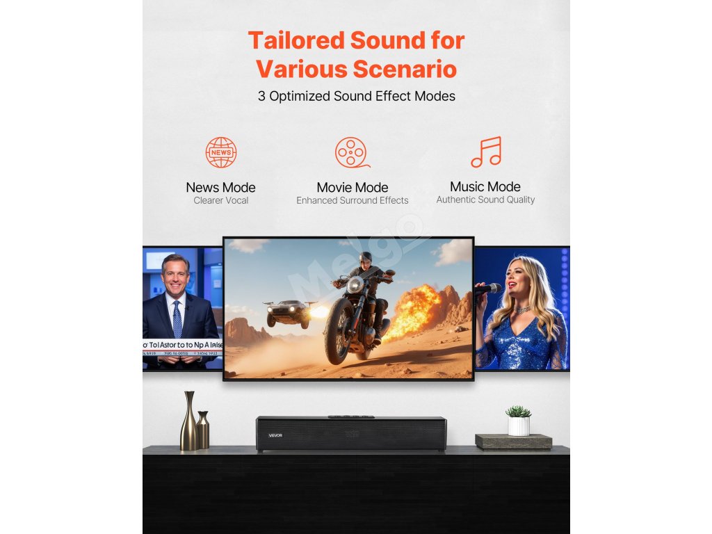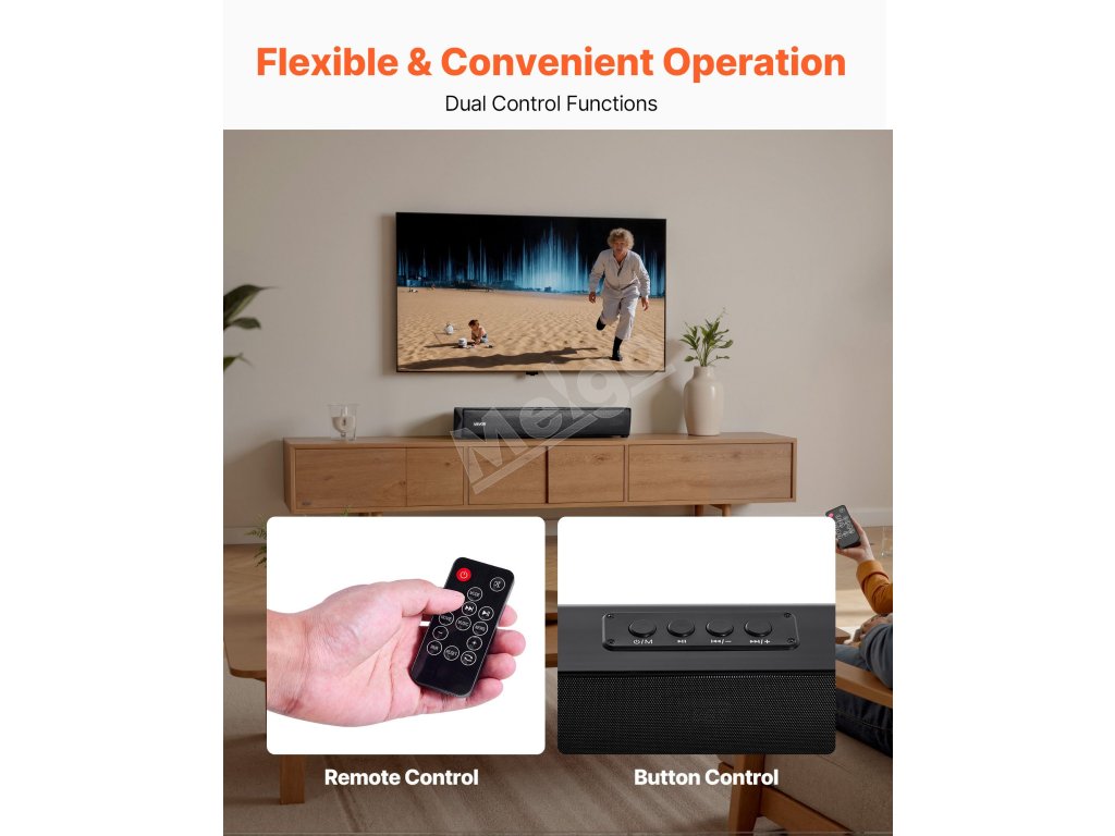 Soundbar s rozhraním Bluetooth poskytuje viacero možností inštalácie, hodí sa na stôl aj na stenu, aby sa prispôsobil vášmu priestoru. Či už je namontovaný na stene alebo umiestnený na televíznom stojane, elegantne zapadne do interiéru, čím šetrí miesto a zároveň zlepšuje vzhľad vašej miestnosti.