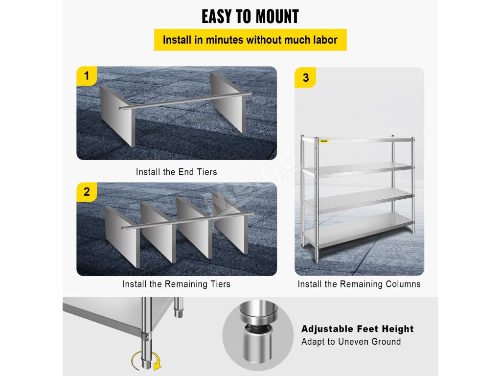 Po dodaní výrobku môžete úrovne rýchlo pripevniť k stĺpom pomocou skrutiek. Štyri nožičky nášho regálu z nehrdzavejúcej ocele sa dajú otočiť, aby pevne stáli na zemi.