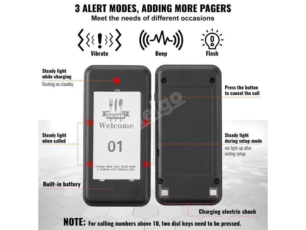 Pager so sociálnym odstupom je vybavený režimami upozornenia LED, vibračným motorčekom a bzučiakom. Zákazníci môžu zvukový signál počuť aj v hlučnej reštaurácii. Slot na papier s reklamným sloganom DIY umožňuje jednoduché prepínanie. Pridaný je štítok s návodom na párovanie, ktorý poskytuje intímny používateľský zážitok.
