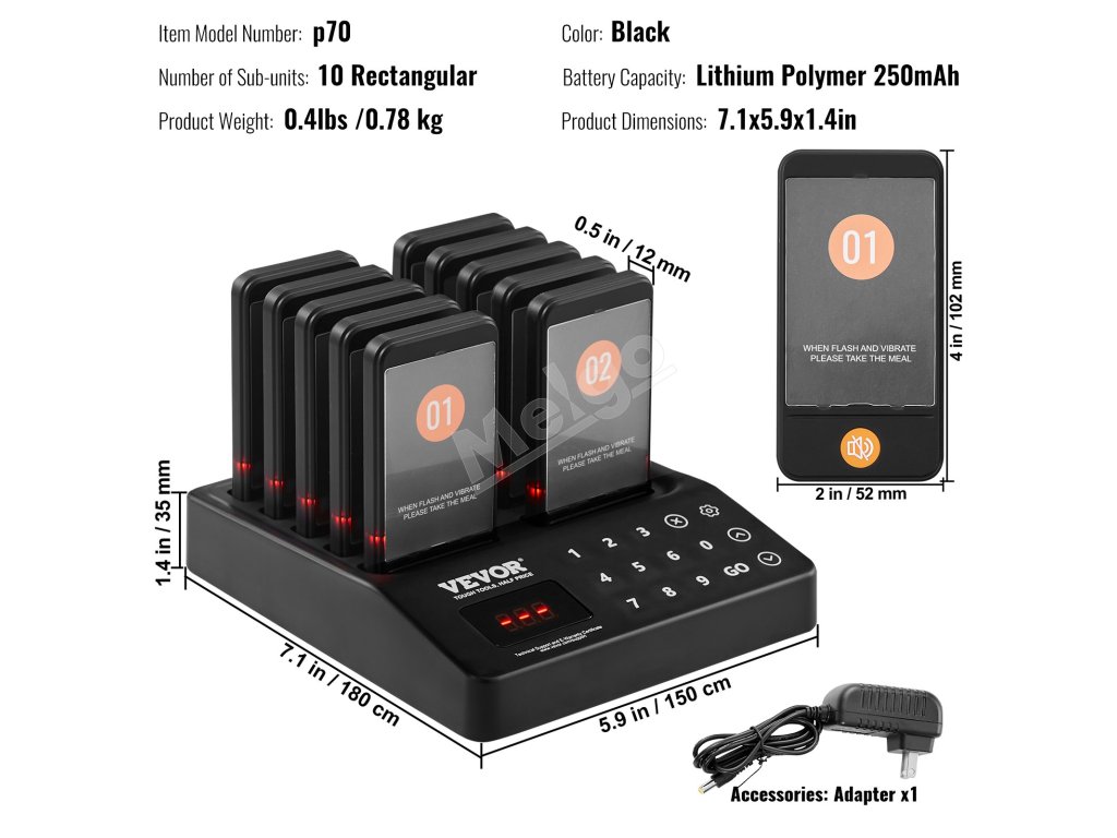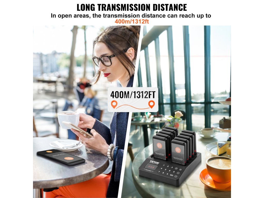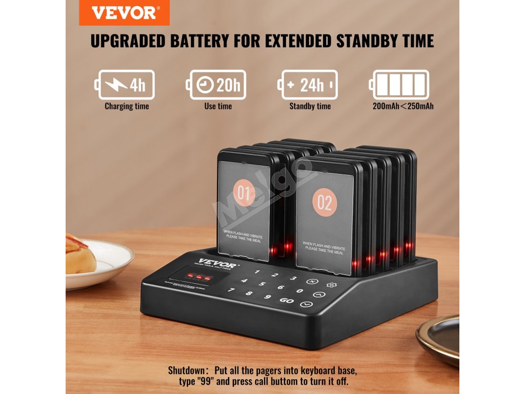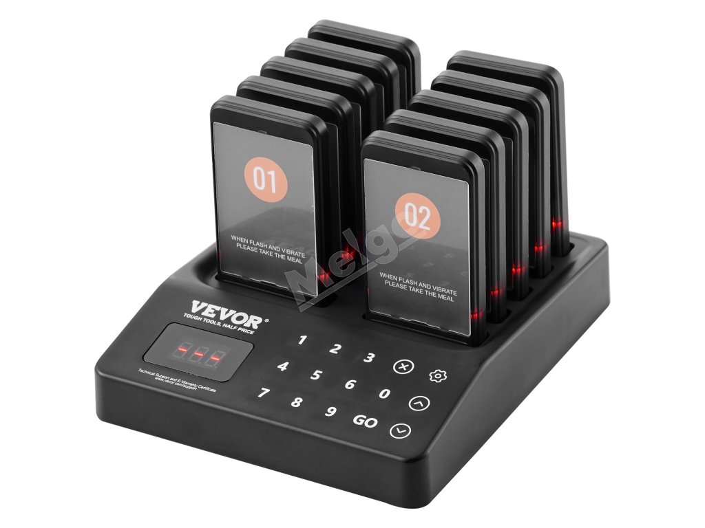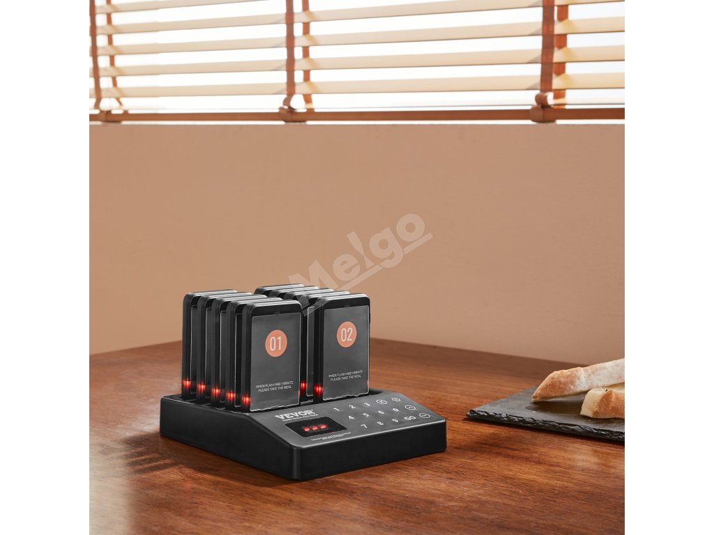 Reštauračný pagerový systém pozostáva z 998-kanálového bezdrôtového vysielača s dotykovou klávesnicou 10 pagerov a základne so 16 jamkami (na následné rozšírenie). Zákazníci nemusia stáť v rade, čím sa zachováva sociálny odstup a zvyšuje efektivita.