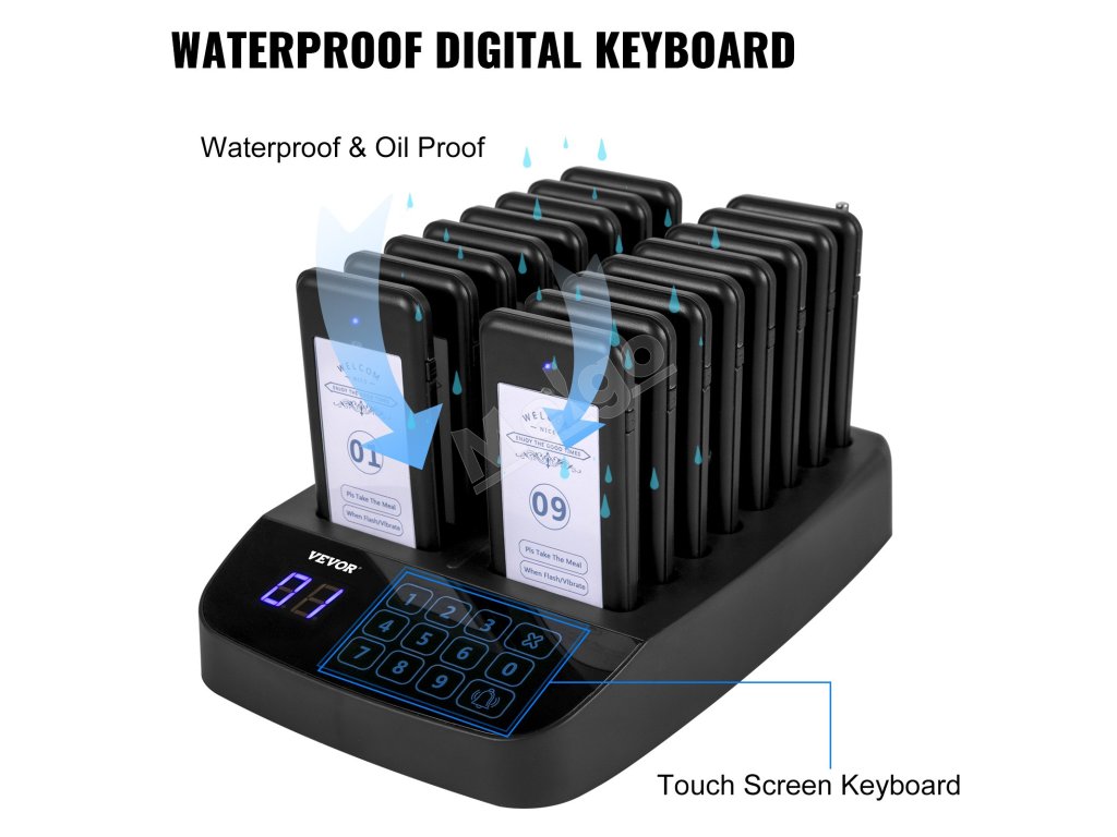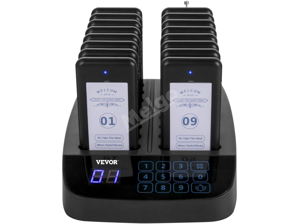 Sada bezdrôtového volacieho systému pozostáva z jednej 98-kanálovej základne s bezdrôtovými volacími tlačidlami a 16 ks bezdrôtových pagerov. Využíva bezdrôtovú technológiu RF a technológiu učiaceho sa kódu a môže ľahko spárovať až 98 kanálov pagerov. Keď zákazník zadá objednávku, bude mu (jej) odoslaný jeden prijímač s číslom. Stlačením klávesnice vytočíte číslo; zákazník ho dostane prostredníctvom bzučiaka/vibrácie/svetelnej indikácie. Je to ideálna voľba pre reštaurácie rýchleho občerstvenia, stravovacie zariadenia, kliniky, kostoly, autoservisy a iné príležitostné fronty.