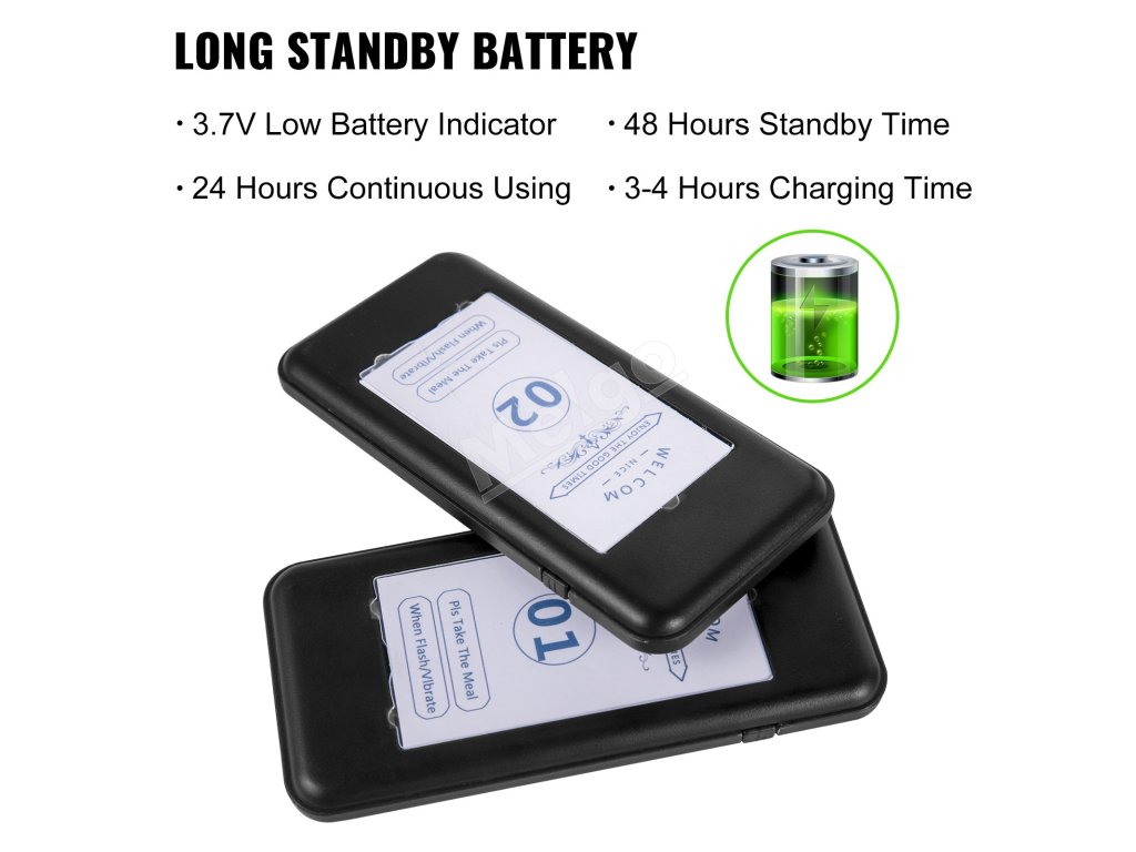 Vibrácie, blesk a bzučiak Viacero rôznych režimov výzvy možno použiť pri riešení rôznych situácií. Systém pípania v reštaurácii výrazne zvyšuje efektivitu práce a zbavuje čakania v dlhom rade.