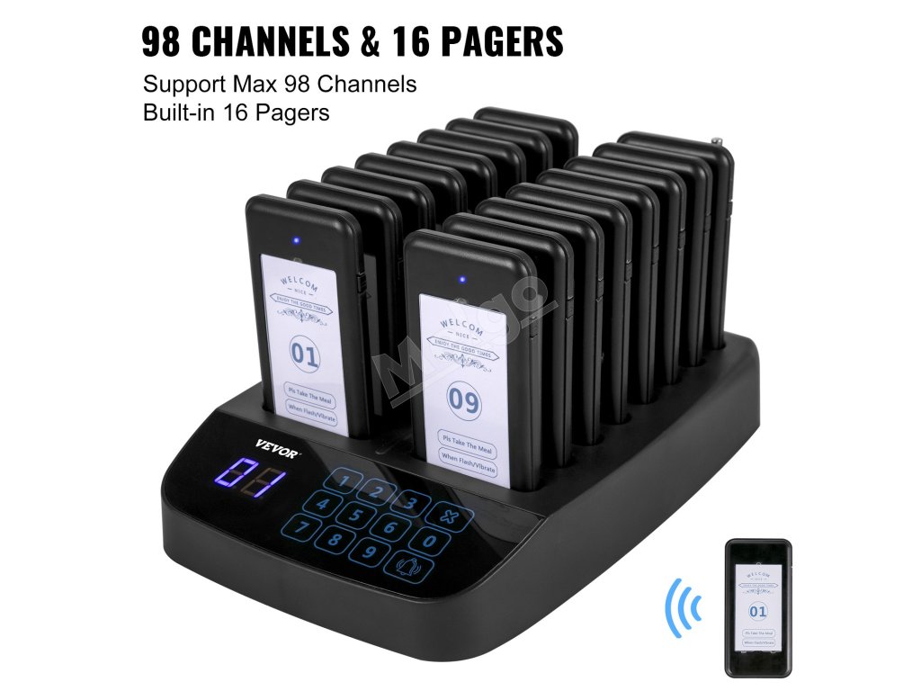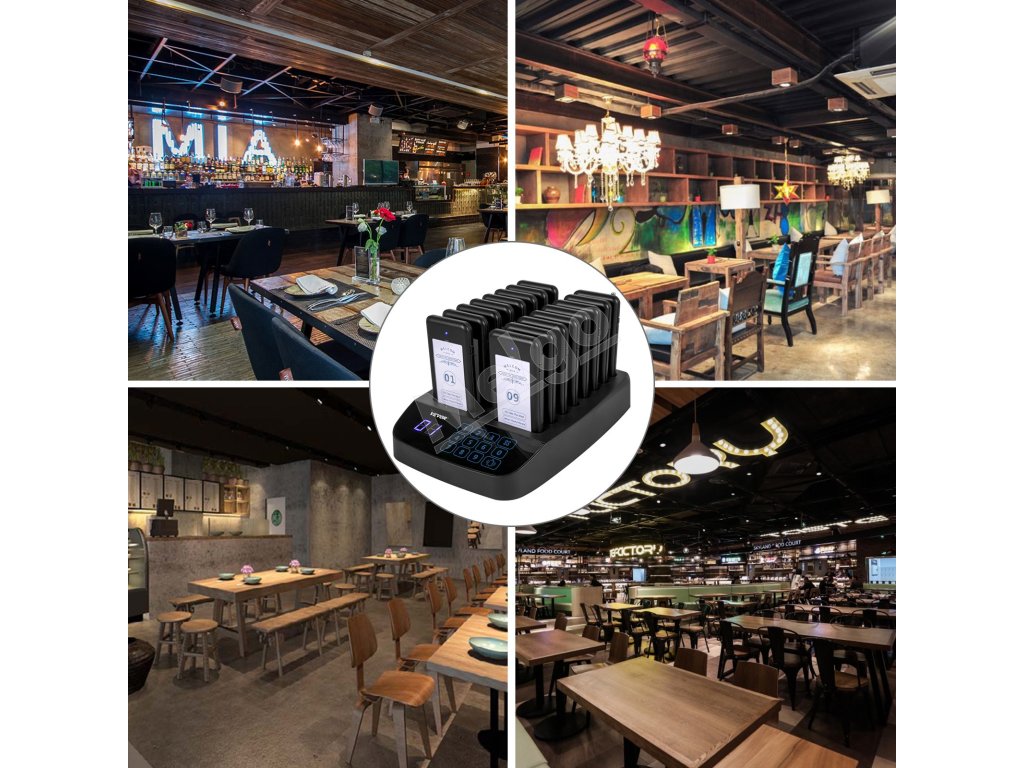 Súprava bezdrôtového volacieho systému pozostáva z jednej 98-kanálovej základne s bezdrôtovými volacími tlačidlami a 16 ks bezdrôtových pagerov. Využíva bezdrôtovú technológiu RF a technológiu učiaceho sa kódu a môže ľahko spárovať až 98 kanálov pagerov. Keď zákazník zadá objednávku, bude mu (jej) odoslaný jeden prijímač s číslom. Stlačením klávesnice vytočíte číslo; zákazník ho dostane prostredníctvom bzučiaka/vibrácie/svetelnej indikácie. Je to ideálna voľba pre reštaurácie rýchleho občerstvenia, stravovacie zariadenia, kliniky, kostoly, autoservisy a iné príležitostné fronty.