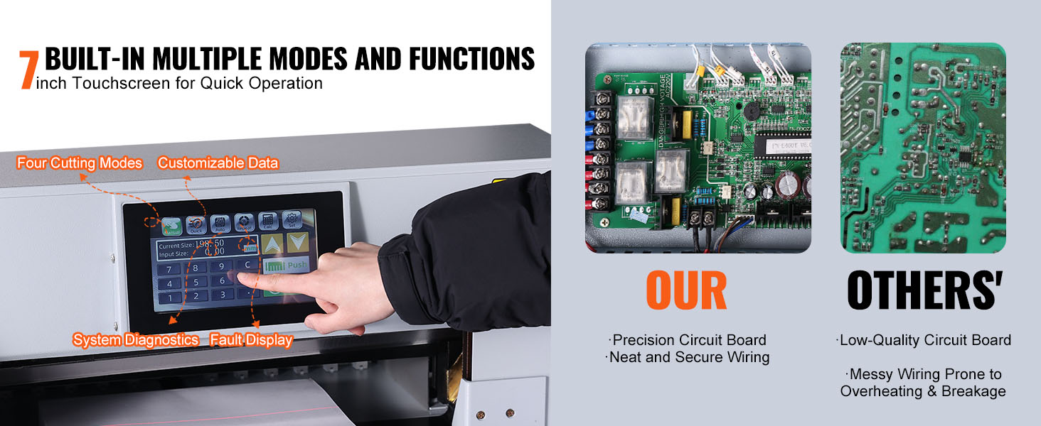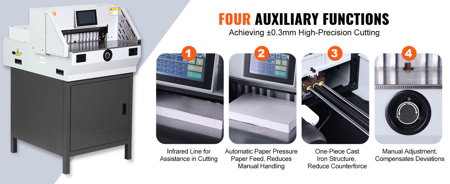 Niekoľko funkcií na udržanie presnosti rezania v rozmedzí ±0,3 mm. Infračervené navádzanie na jasné polohovanie, automatický prítlak a podávanie papiera na minimalizáciu vplyvu človeka, jednodielne liatinové telo na zníženie rezných síl a chýb a manuálne doladenie na kompenzáciu rozdielov vo veľkosti.
