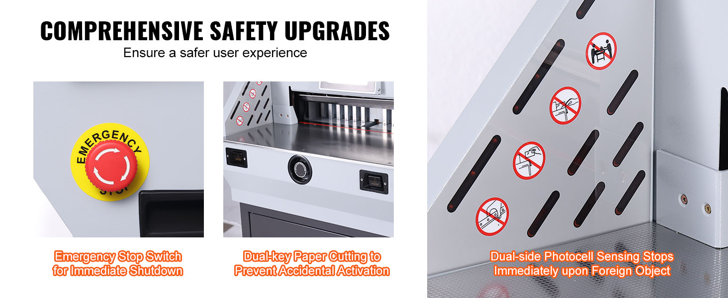 Na zaistenie bezpečnosti počas prevádzky sme na každej strane zabudovali 9 fotoelektrických snímačov, ktoré zastavia elektrický orezávač papiera pri zistení cudzích predmetov. Dvojtlačidlová aktivácia zabraňuje náhodnému spusteniu a núdzový vypínač zabezpečuje okamžité vypnutie v núdzových prípadoch.